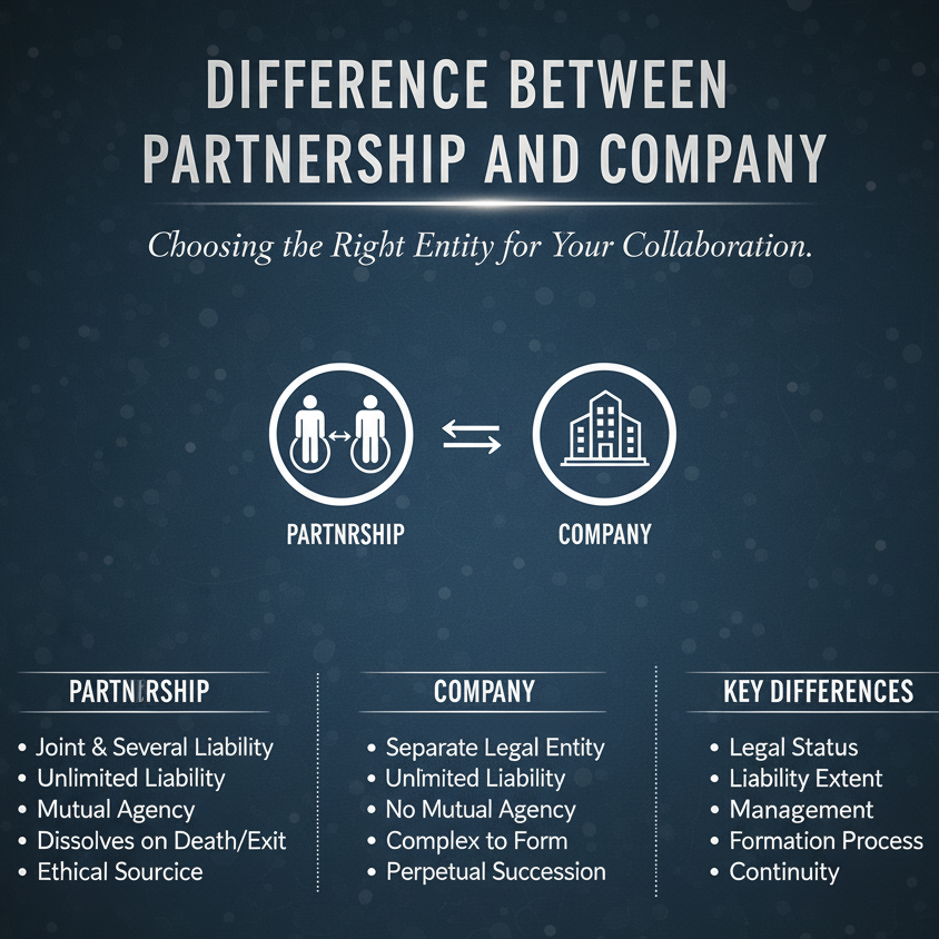 Abstract: This article explores the fundamental differences between two of the most common business structures: partnerships and companies. A company, as defined under the Companies Act, 2013, is a separate legal entity that enjoys benefits like limited liability, perpetual succession, and the ability to raise capital. On the other hand, a partnership, governed by The Indian Partnership Act, 1932, is a relationship between individuals aimed at profit-sharing with fewer formalities and regulatory requirements.