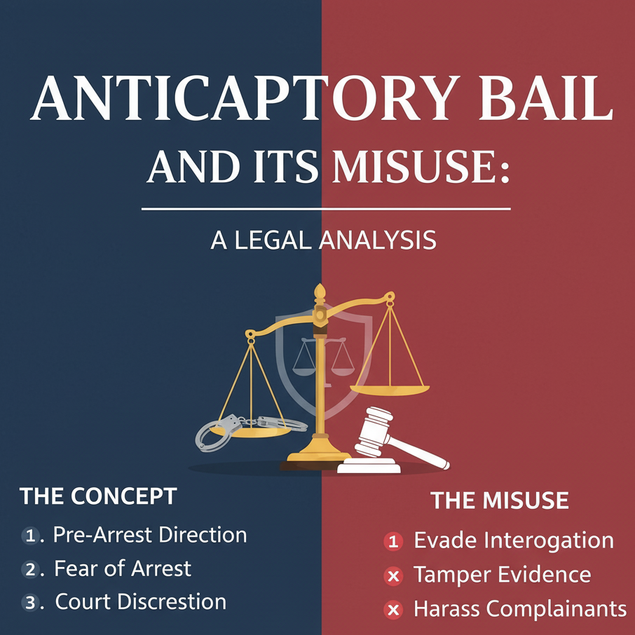 Anticipatory Bail is a very important shield against arbitrary arrest, which is conferred by Section 438 of the Code of Criminal Procedure. It was created to shield the innocent from embarrassment or ridicule. But of late, this very provision is being abused. Now, some in fact use it, not as a protective doctrine but as a means to avoid justice or impede the law. This article examines the concept of anticipatory bail, its legal backdrop, judicial understanding and the possibility of abuse of the same. It also reviews the landmark and recent case laws and offers reforms to prevent their abuse.