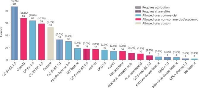 This chart shows the prevalence of different license types and their associated requirements, such as attribution, share-alike, commercial use, and non-commercial/academic use. For example, CC BY-SA 4.0 is a general license with a high number of attributions, share-alike, and diverse usage scenarios. CC BY-NC 4.0 focuses primarily on non-commercial and educational use. The presence of “custom” license types also suggests a significant number of unique, custom-defined terms in licensing practices. Furthermore, specific incompatibilities may arise between licenses, as evidenced by conflicts between proprietary and open-source licenses or even between different open-source licenses, often indicated by restrictions on distribution and modification.