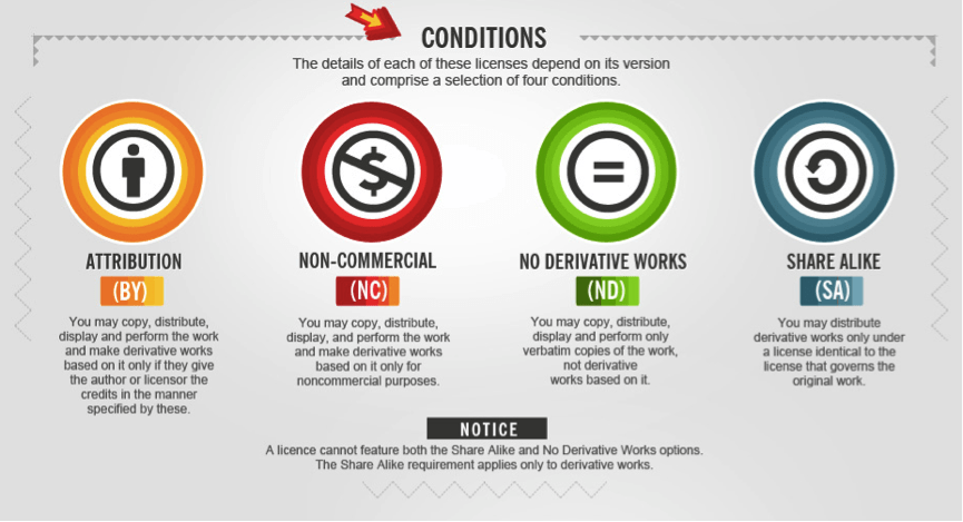 Four core elements of Creative Commons licenses are assembled from four basic conditions, which can be combined to create a number of licensing options: