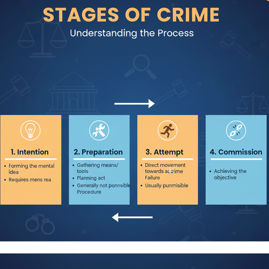 In State of Madhya Pradesh v. Narayan Singh And Ors. [1] Supreme Court observed. – “ In the commission of an offence there are four stages viz. Intention, Preparation, Attempt and Execution. The first two stages wouldn’t attract culpability but the third and fourth stage would certainly attract culpability.”https://ledroitindia.in/product/legal-research-writing-live-certificate-course/